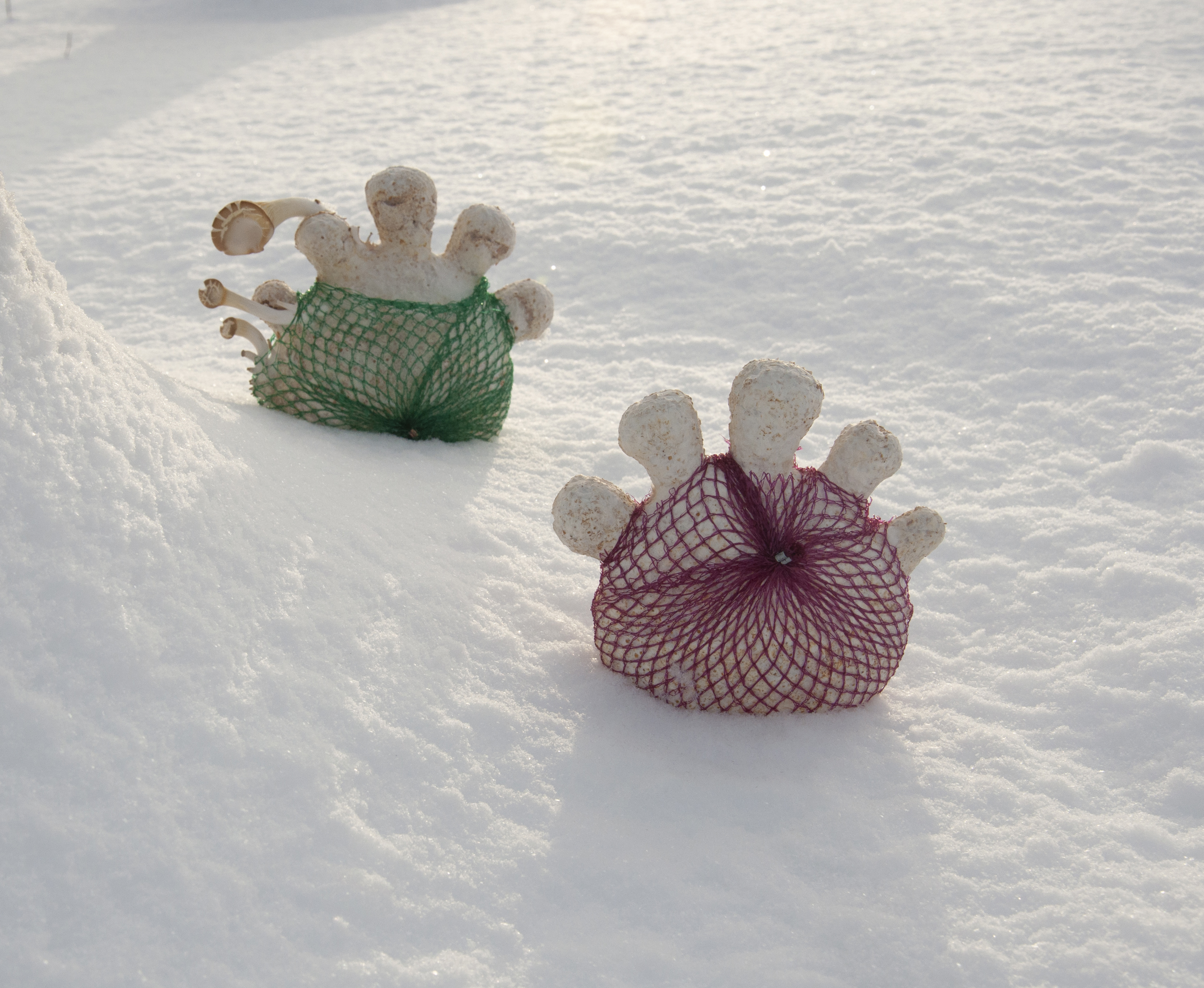 Human society has left increasingly deep footprint on nature environment. Gradually and in a long time period, nature and us are in a relationship of symbiosis. This project was trying to describe this abstract relationship by concretizing it into a collection of characters. Mycelium mixture represents the nature system which is alive and reproducible. The other parts come from disposable silicon nipple, leftover steeltube, nail and nylon mesh bag. They are one of the best witnesses to human social activities. When they are combined, the new relationship was created.