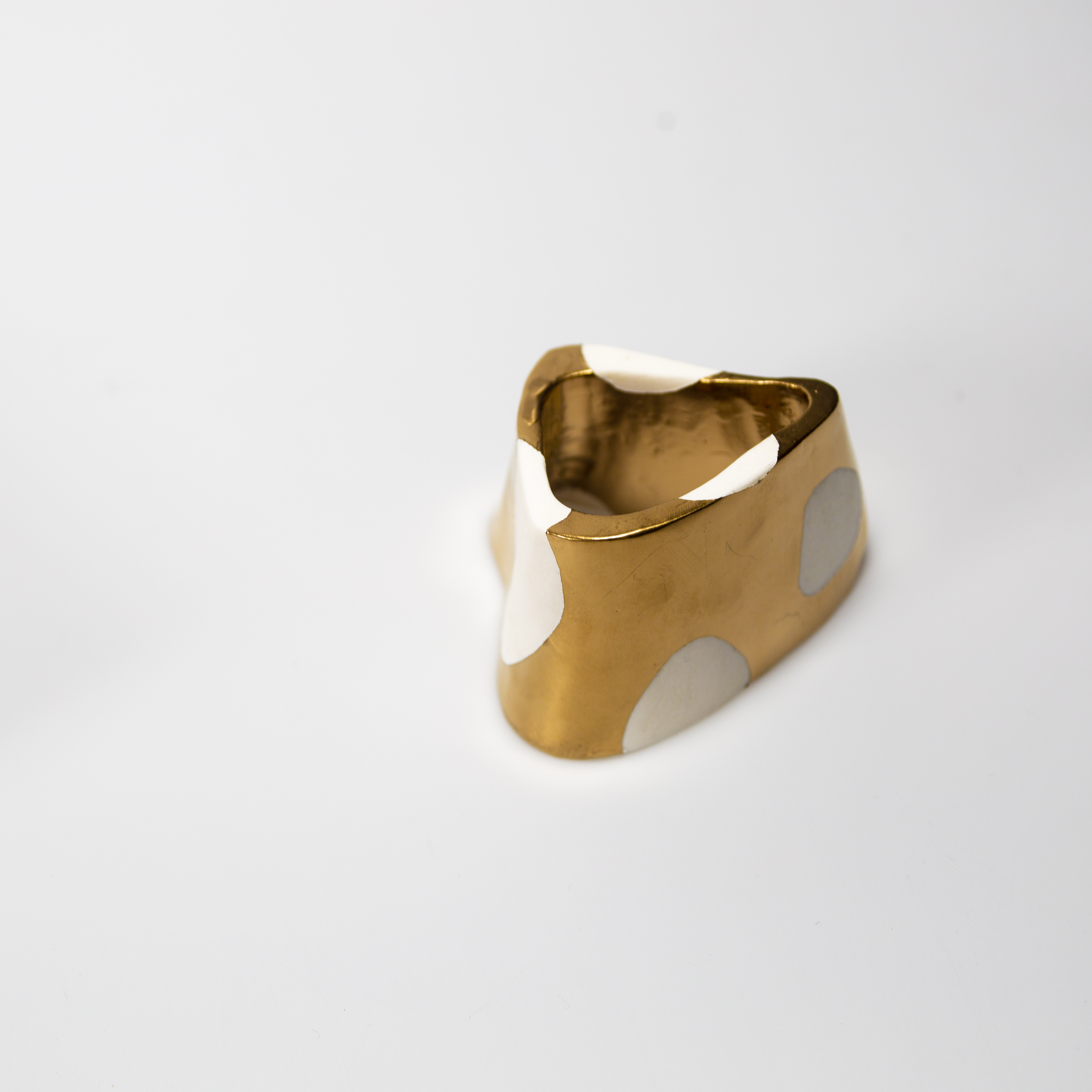 The ox bones were found in food waste from the local markets. After several treatment I painted them with gold color. The metal reflection highlights the curvy shape and create contrast. Organic & artificial, waste and luxury. The hollow part functions as a natural container for dry plants